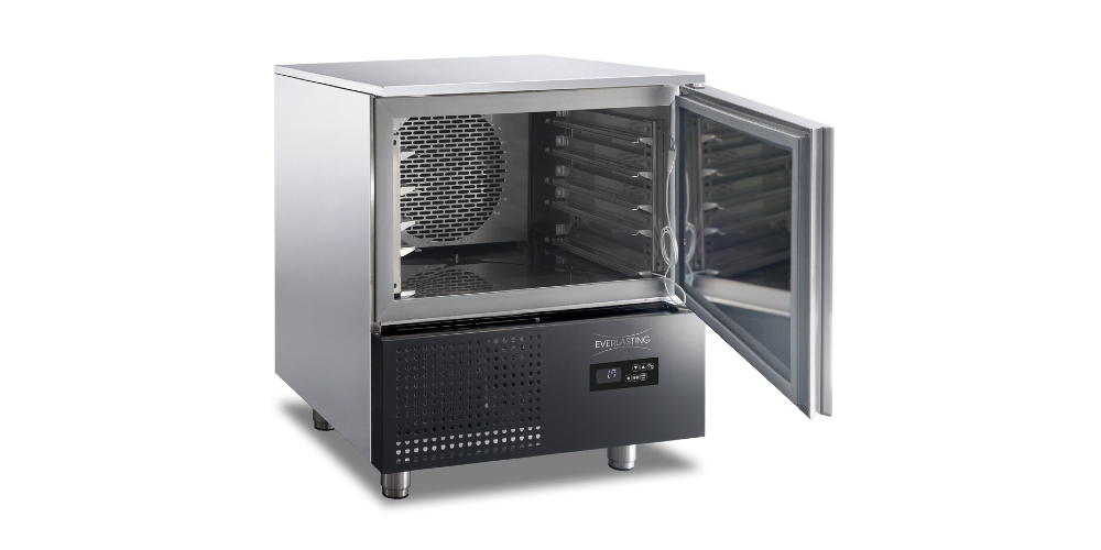 Everlasting BASIC Tray 05, countertop or under counter, 5 tray/rack blast chiller shock freezer, providing 25kg chilling and 18kg freezing capacity, (+90⁰C to +3⁰C and +90⁰C to -18⁰C). Designed to take 5 x GN1/1 and 5 x 600 x 400 (mm) trays/pans/shelves on adjustable dual tray stainless-steel supports. Choice of SOFT and HARD chill and freezing cycles by core probe or time, with end cycle refrigerated or frozen storage. Bottom mounted R452a refrigeration system. Supplied on adjustable legs or castors, with digital electronic control panel to base, stainless-steel interior and exterior, with 230/1/50hz 13 amp plug connection. Holds 6 x 5 litre ice cream containers positioned on shelf racks.