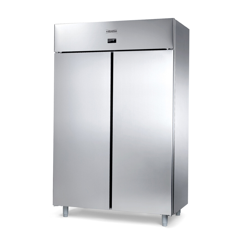 Quick Slimline 1200 x 743 (mm), double stainless-steel door, low height 924 litre, upright reach in freezer. Designed to hold 480 x 480 (mm) shelves on stainless steel anti-tilt supports, with top mounted energy efficient R290 refrigeration system. Supplied on castors with quick cooling function, internal light, door locks, intelligent controller and HACCP alarm system as standard.